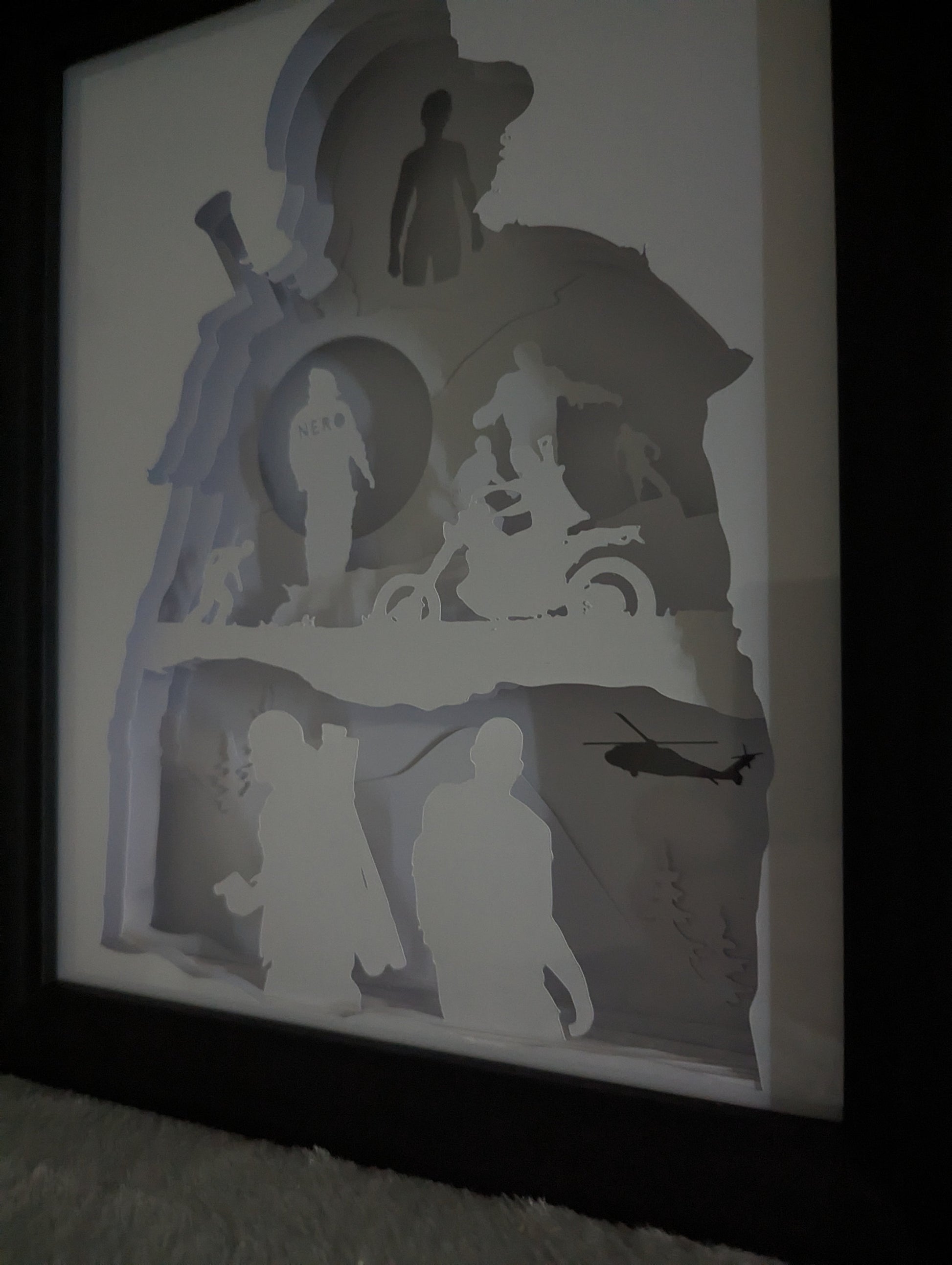 All Frames are custom designed by me and assembled by hand with intricate cut cardstock assembled in layers and finished with led lights to provide shadow effect, slight changes can be made just let me know.