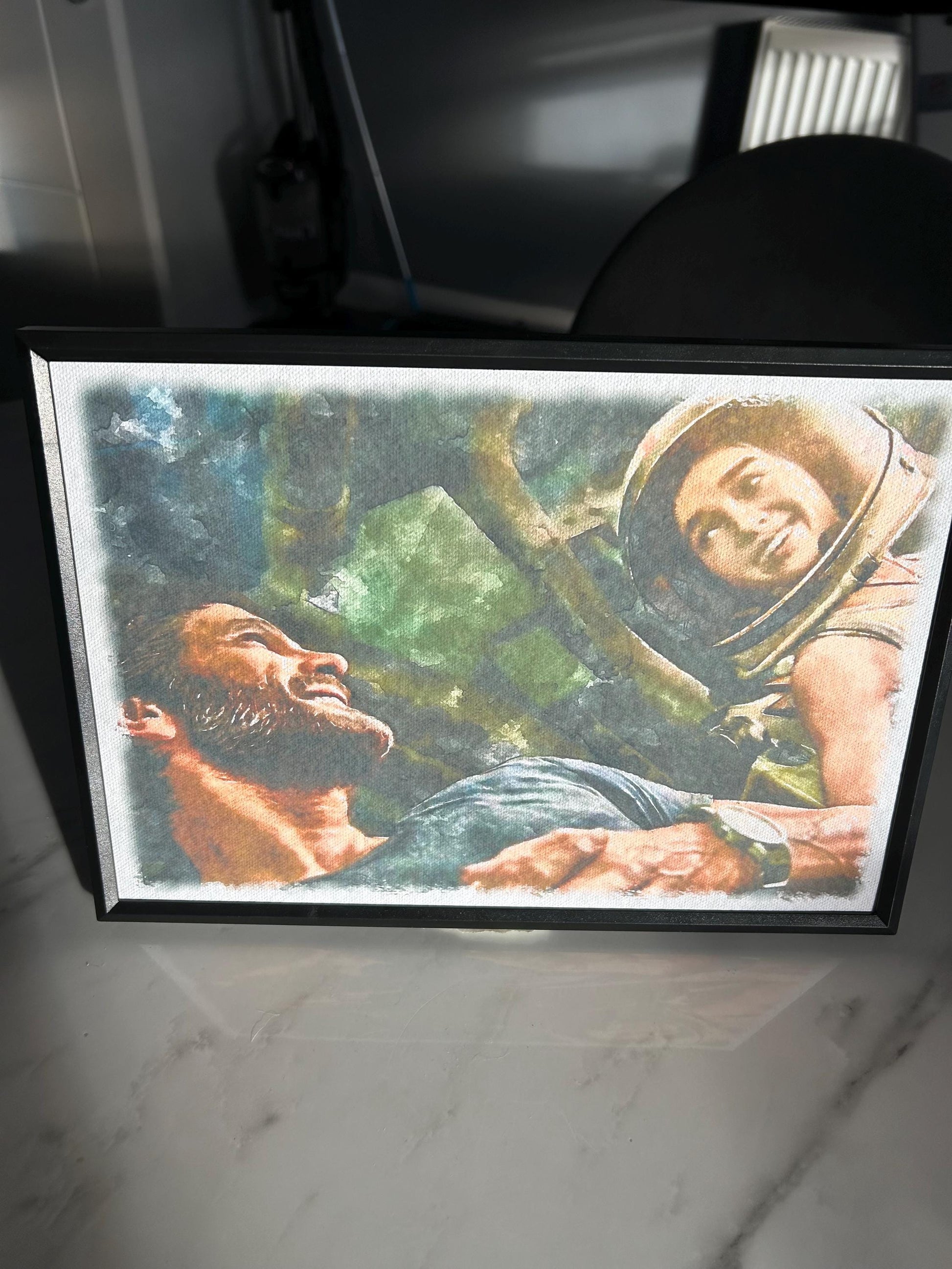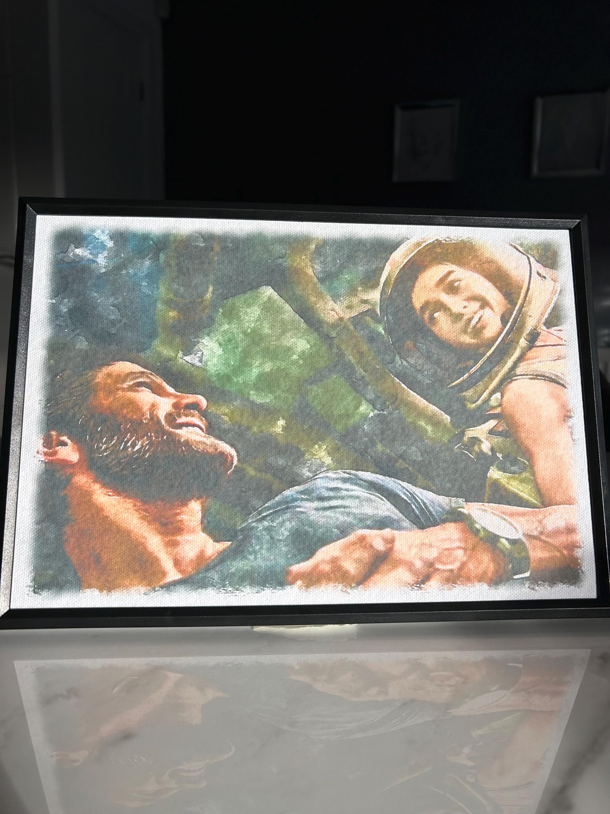 A watercolour poster on hammered card of Joel & Ellie