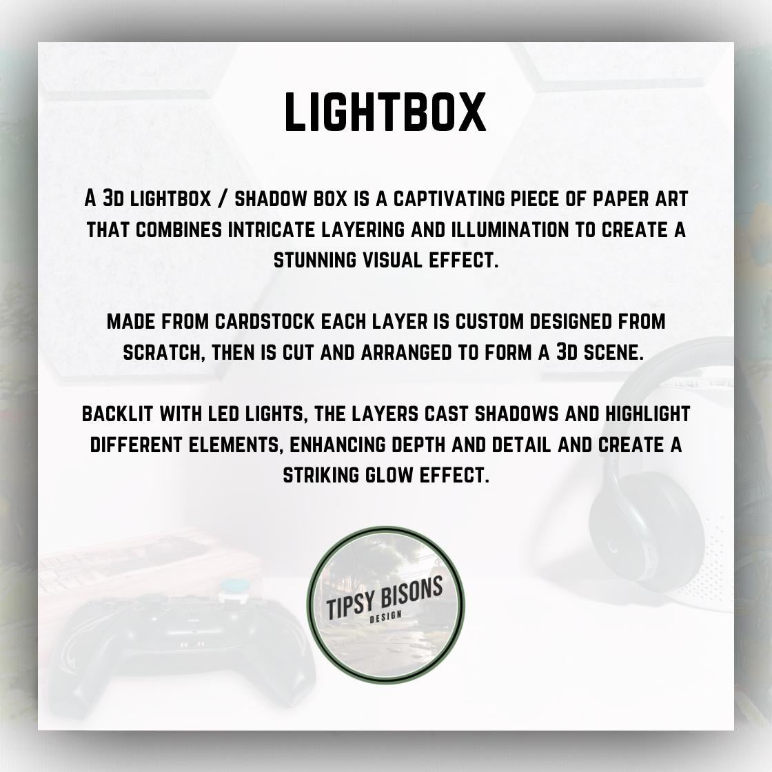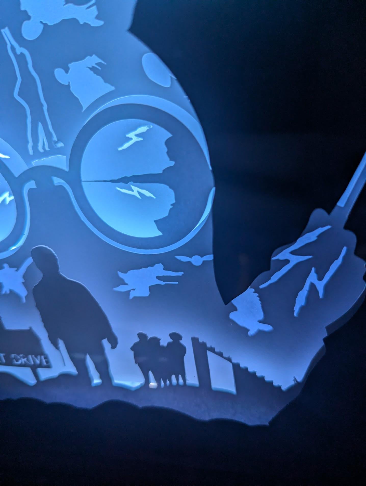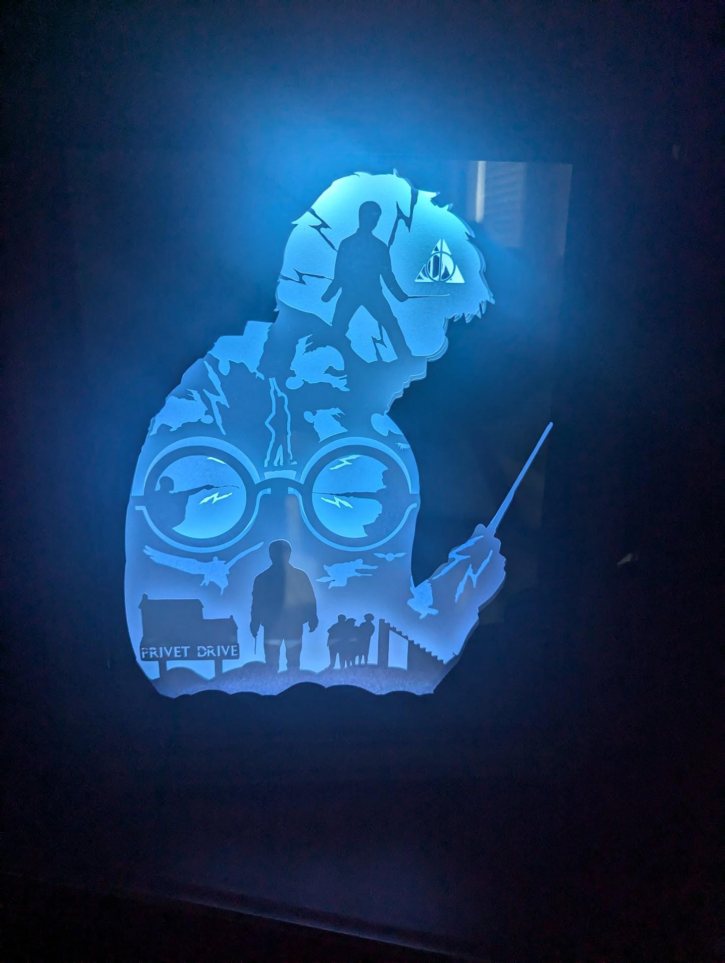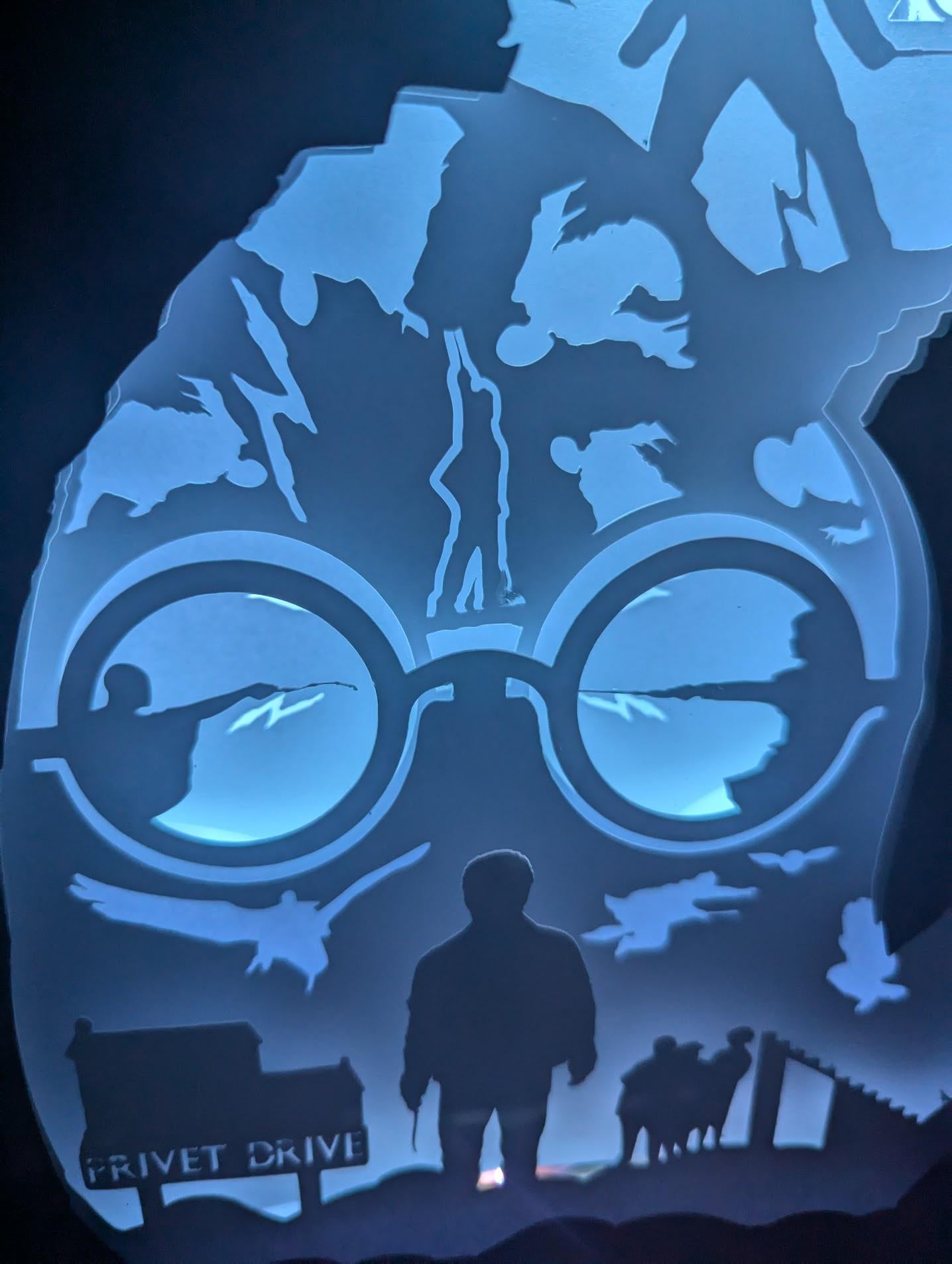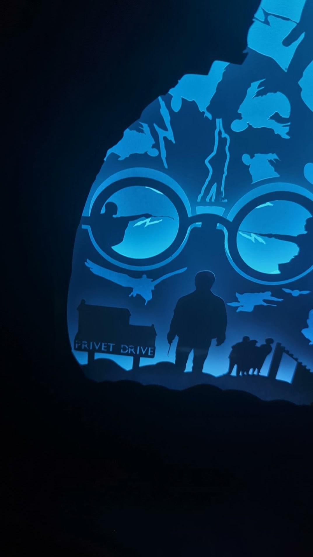 Here is our Harry potter Inspired light box, featuring Harry potter's journey including the dursleys, privet drive, his battle with Voldemort, dementors and the deathly hallows.
