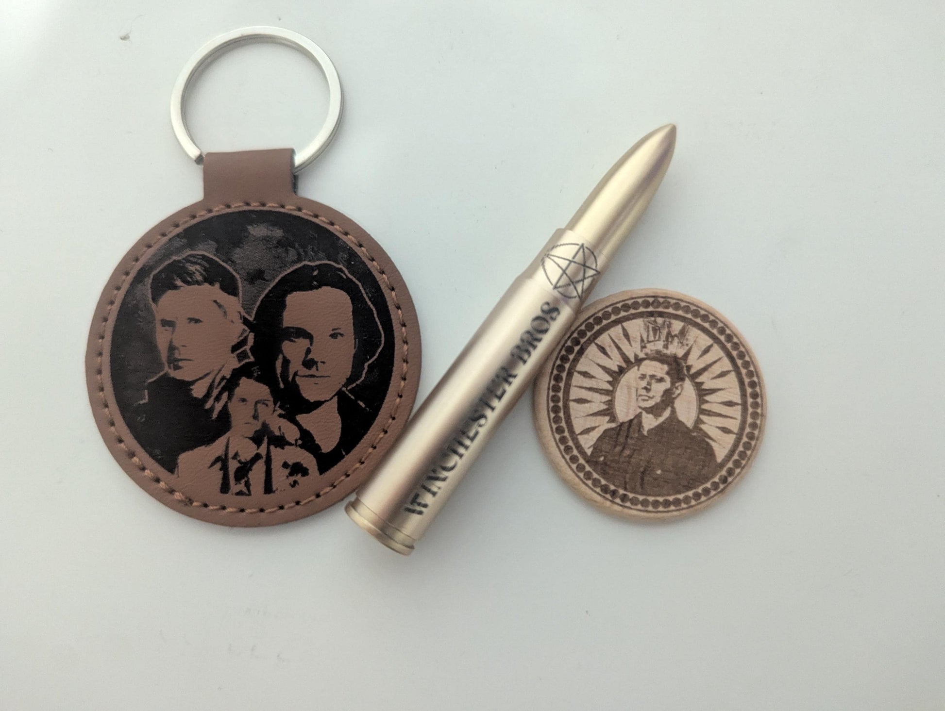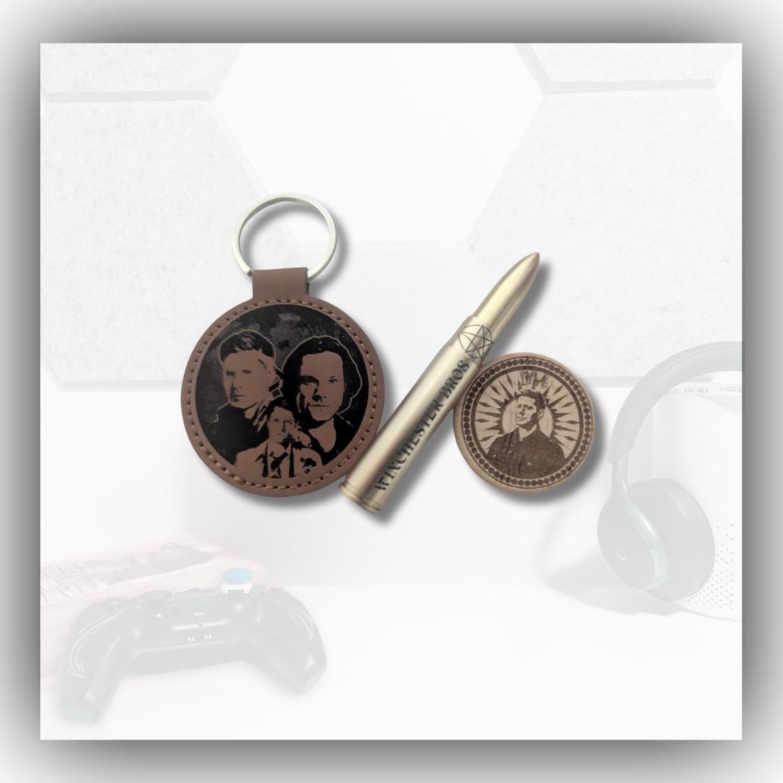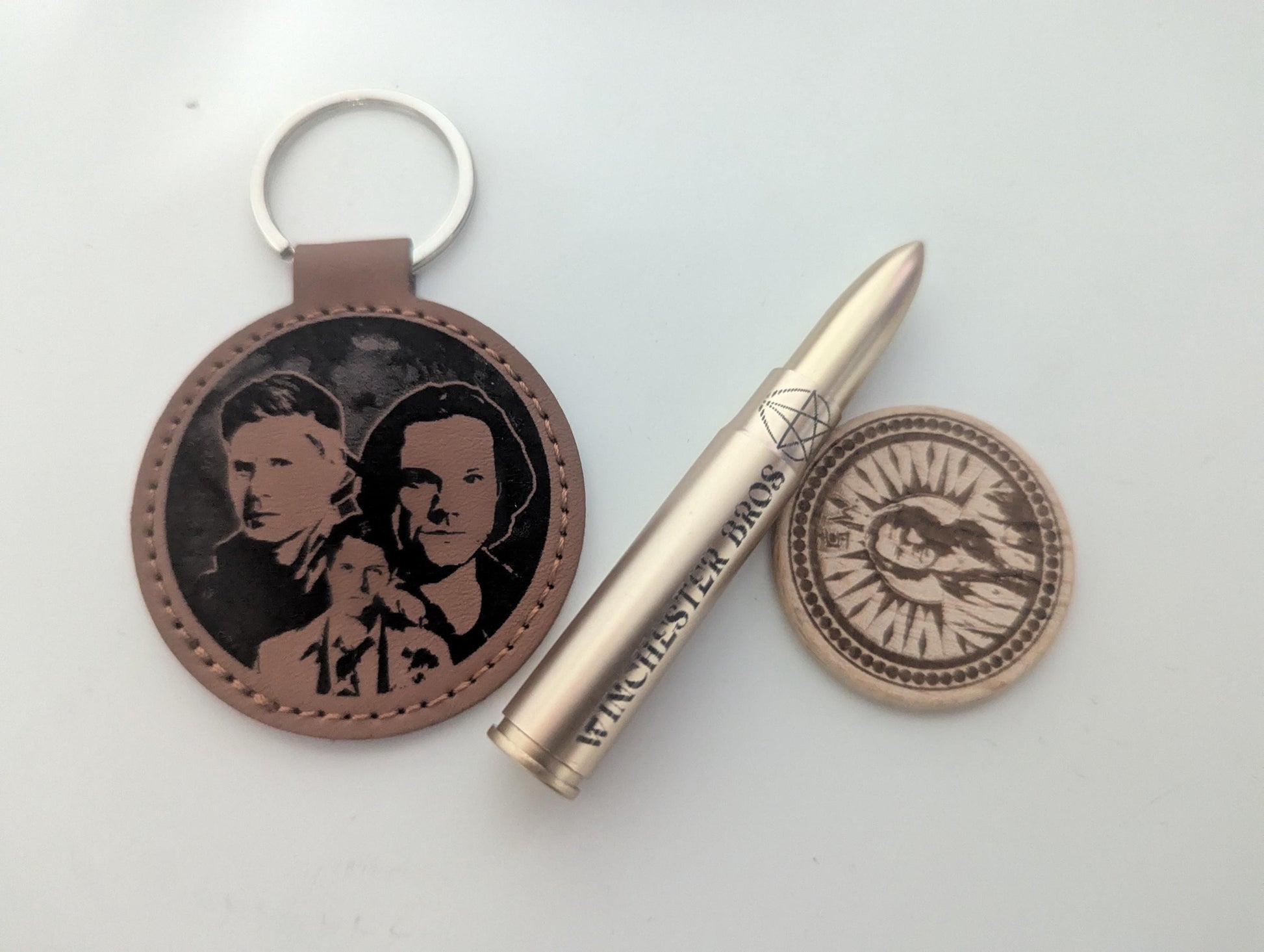 -- Custom engraved wooden coin with Dean on 1 side and Sam on the other