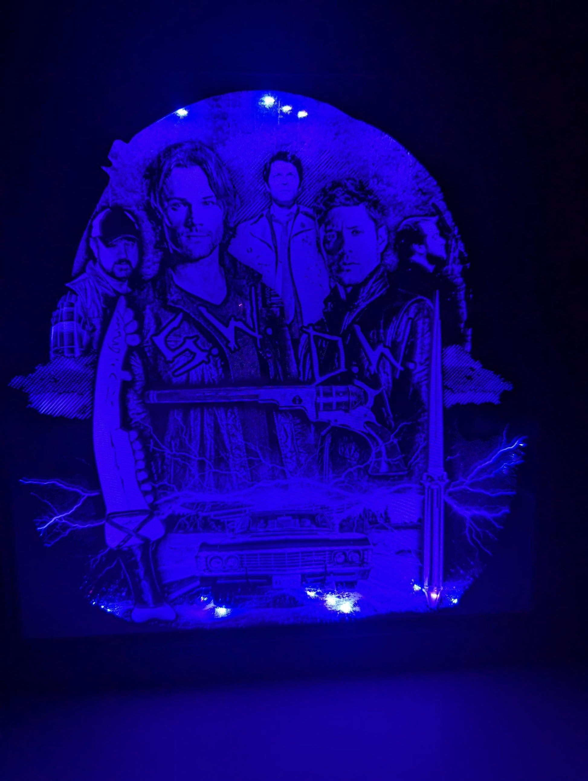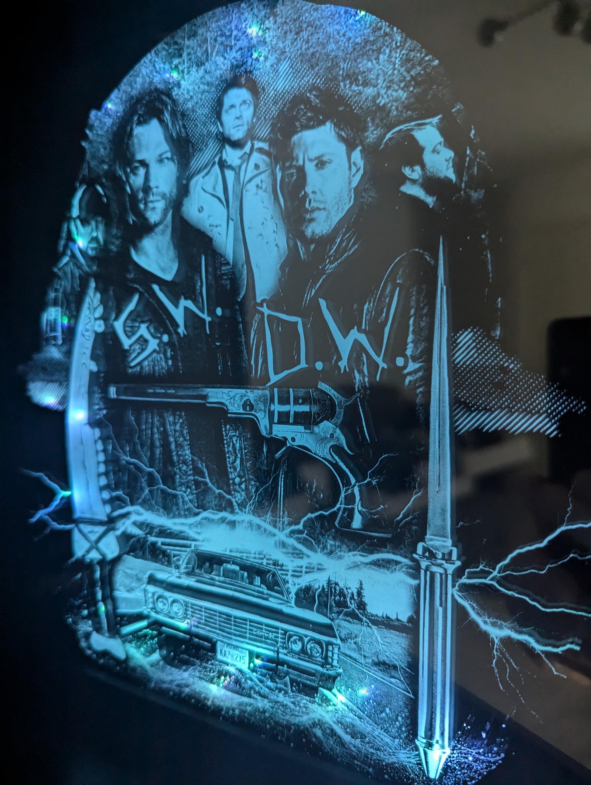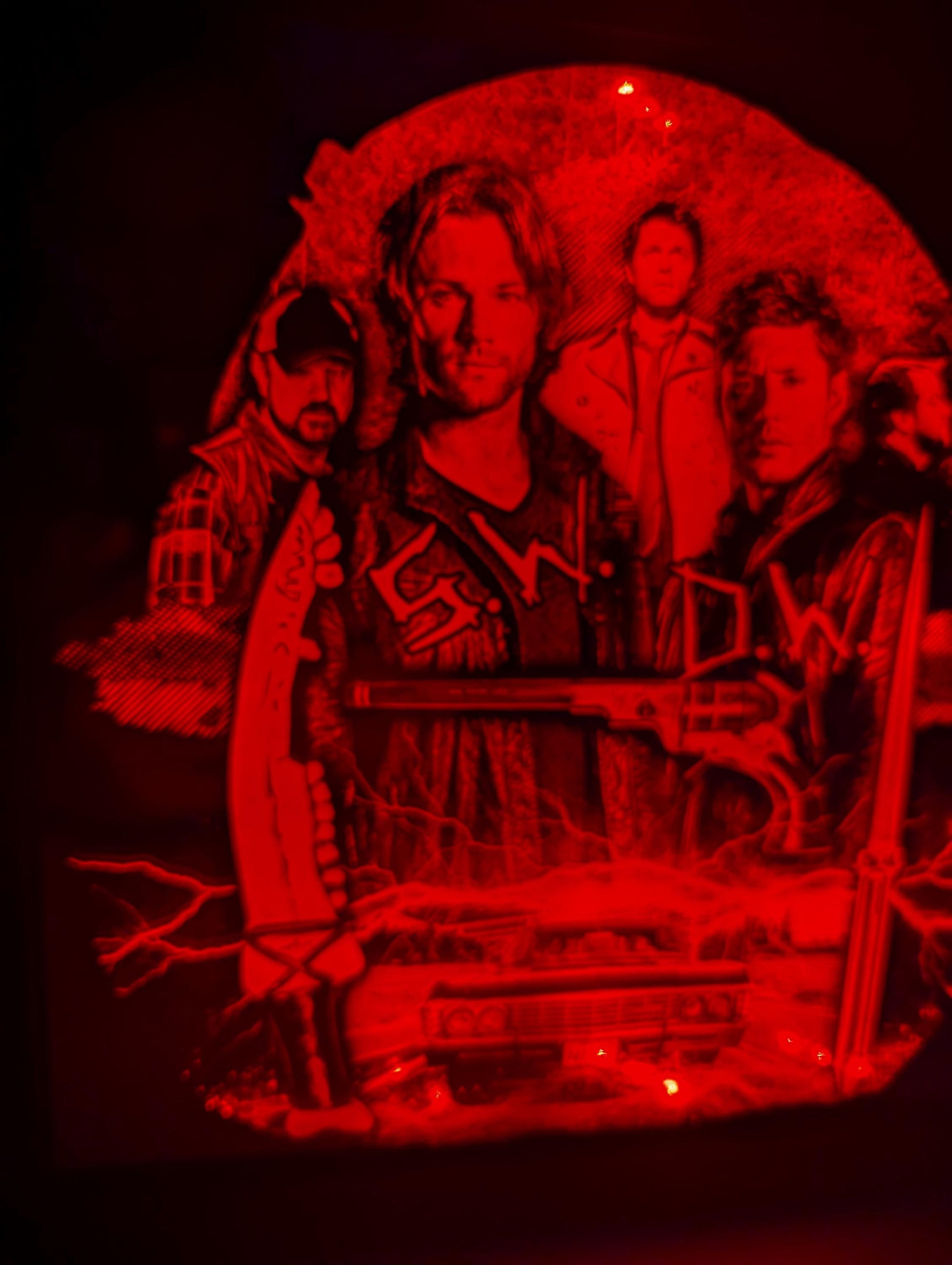 Supernatural fans unite check out this unique custom designed laser engraved backlit mirror, it shows Sam and Dean Winchester, Crowley and bobby. really unique item.