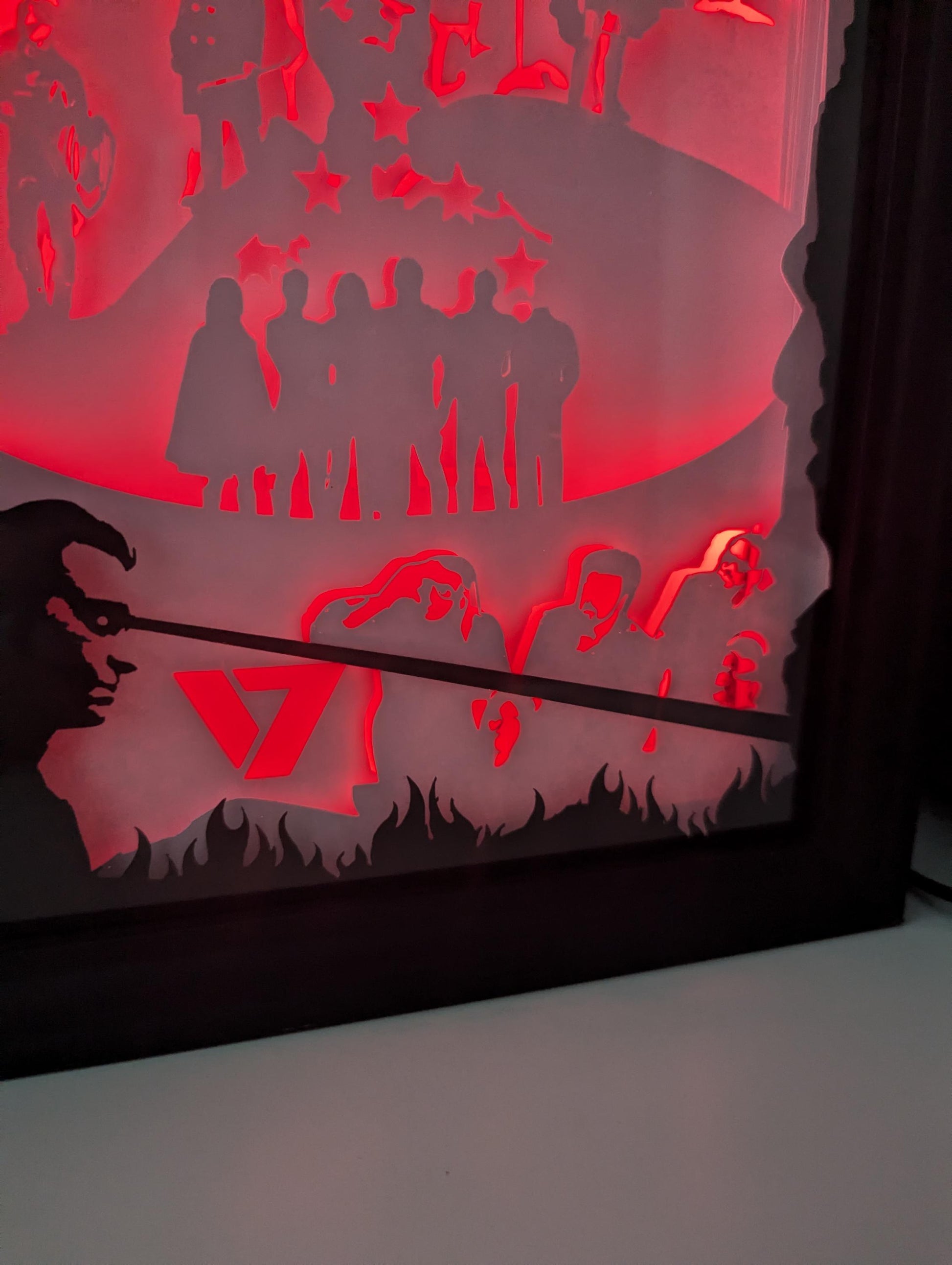 The Boys fans unite check out this unique lightbox that shows the 7, Homelander Butcher and soldier boy. There is not much merchandise you can get for this excellent Tv show so I had to make something.