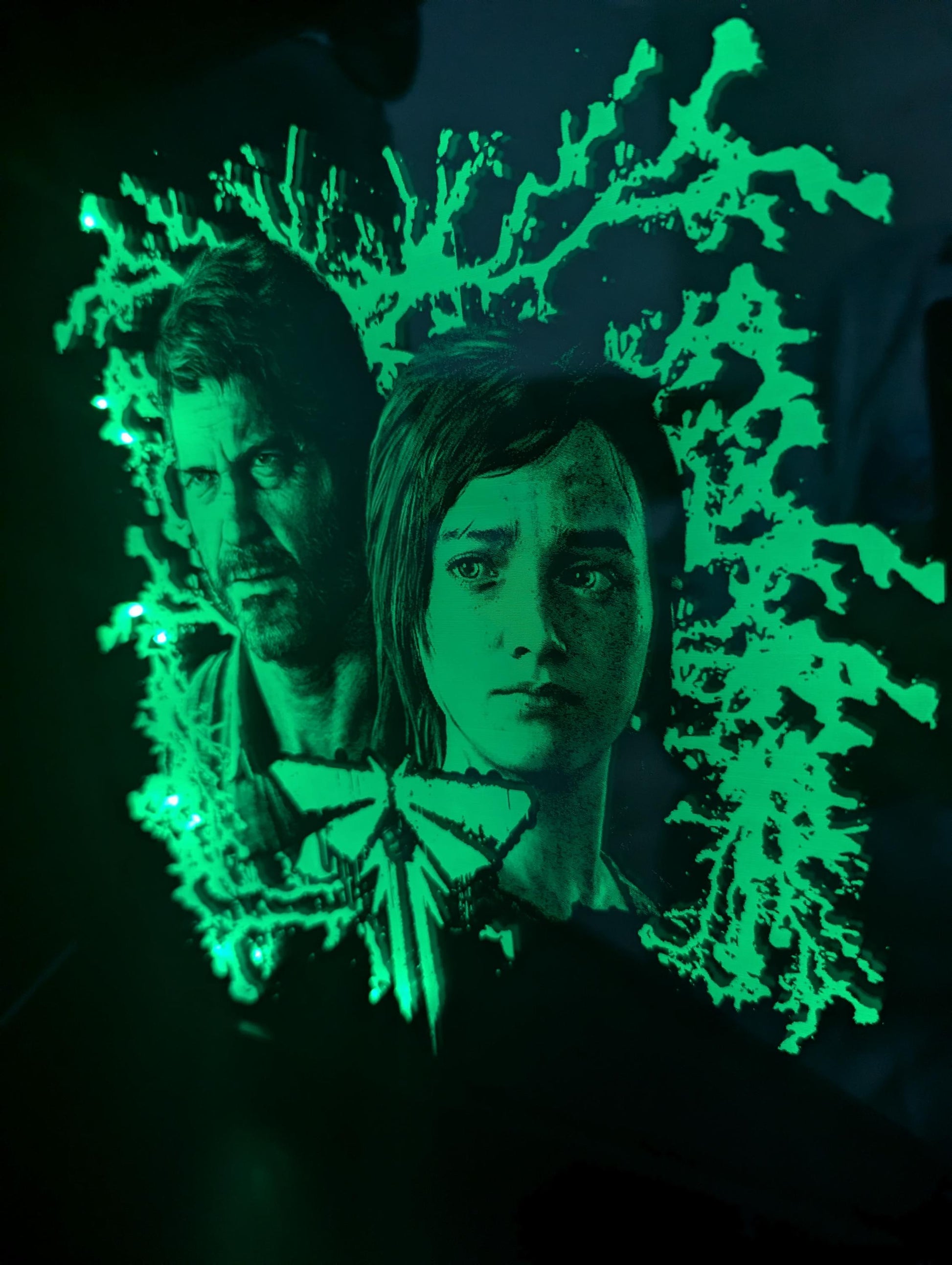 The Last of us fans unite check out this unique custom designed, laser engraved backlit mirror, it shows Joel, ellie and the firefly logo