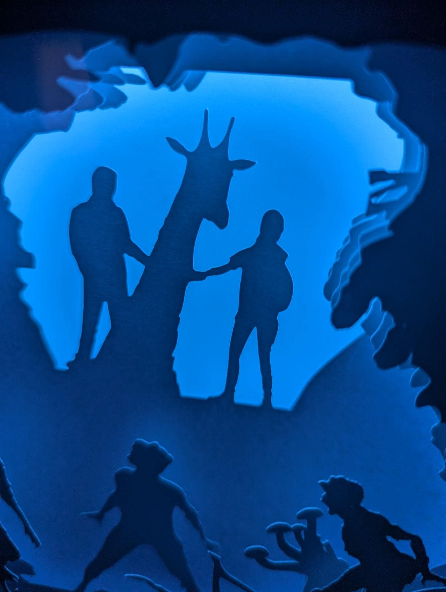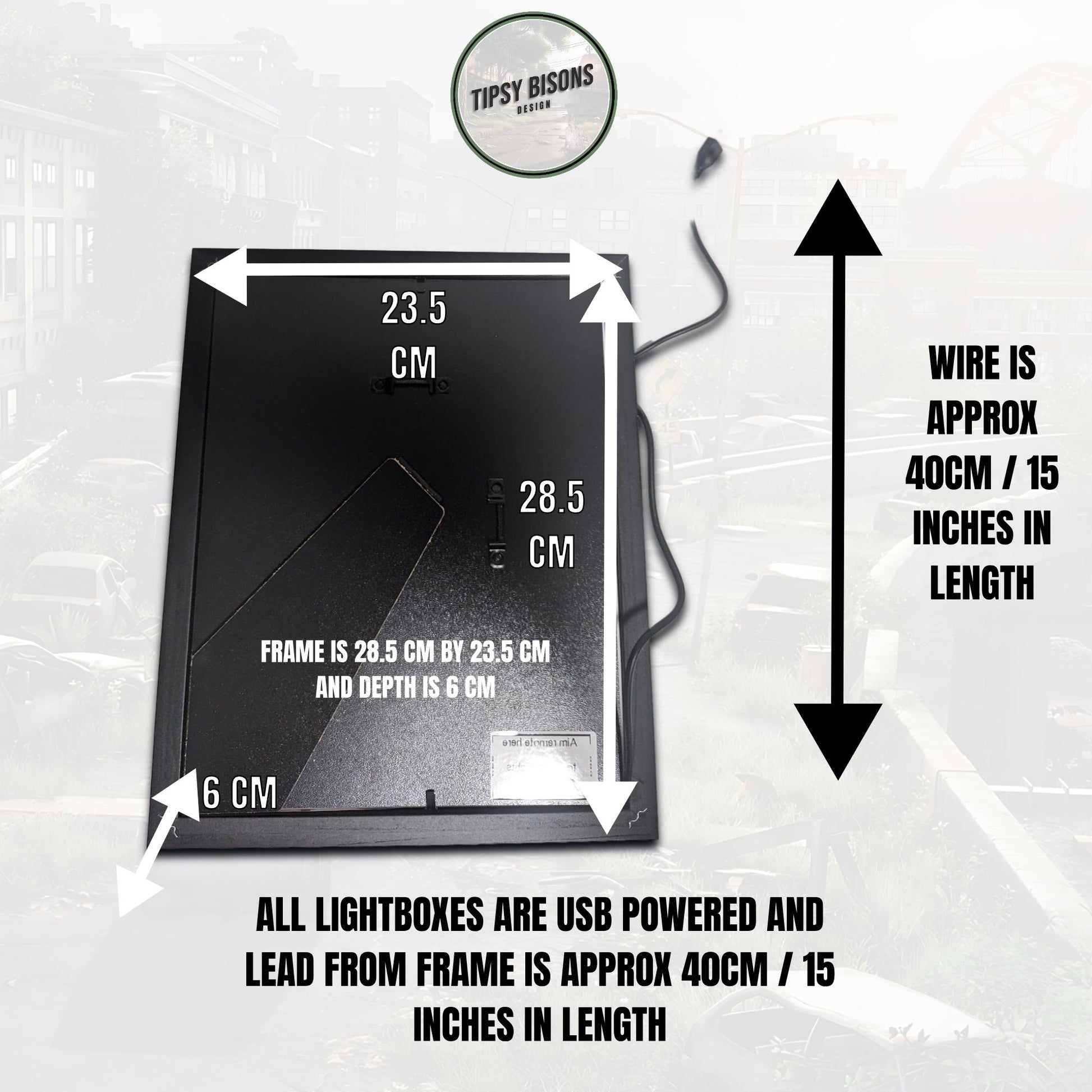 Calling all fans of The Last Of Us! You won't want to miss this one-of-a-kind lightbox featuring Joel and Ellie, iconic scenes from the game, and even some infected. It's a must-have for any die-hard fan looking to bring home a truly special piece from this beloved game. Plus, with its wooden box frame, custom designed art, and LED strip lights, this lightbox is sure to stand out. Don't forget to check out our extras for even more options to enhance your experience. And with our various delivery options, you'll have your unique lightbox in no time. Whether it's for yourself or as a gift, these frames are perfect for any fan looking for a little bit of quirky, fun, and humorous style in their home. And if you have any custom ideas in mind, don't hesitate to reach out - we're always looking for new and unique designs to add to our collection. So keep an eye out for even more incredible creations coming your